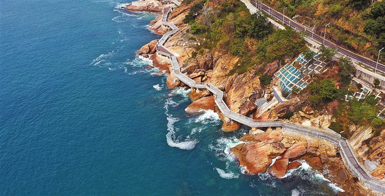 Situated at the coast of Yantian in the eastern part of Shenzhen, the 19.5-kilometer- long Yantian Waterfront Boardwalk is the city’s most famous waterfront for the spectacular ocean views. It starts from Zhongying Street in the west and runs along the golden coastline. It connects Shatoujiao, Yantian Port, Dameisha and Xiaomeisha. There are three main passages: the urban life shoreline includes the Zhongying Street coastline plank road and the seascape environment; the industrial port area shoreline, and natural ecological shoreline along the Damiesha and Xiameisha area. (SD-Agencies) |