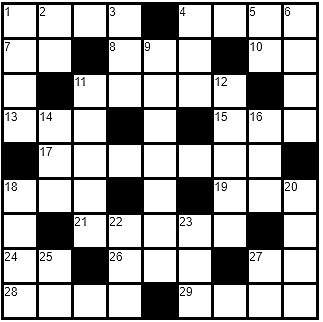 Across 1. Speed ____; slows traffic 4. Zero 7. A single one 8. Self image 10. Body odor (abbr.) 11. Look without blinking 13. Tell an untruth 15. Fall behind 17. Yells 18. Feline 19. Unit of electrical resistance 21. Looks to buy 24. Morning 26. Sight organ 27. I am; he __; you are 28. Injure 29. A gentleman Down 1. Spherical toy 2. Prefix meaning not 3. Caress 4. Either, or; neither, ___ 5. Pound (abbr.) 6. Lengthy 9. Handheld electronic game 11. Groups of the population 12. Belonging to Sesame Street’s red monster 14. “Love __ _ Many Splendored Thing” (two words) 16. Fire remnant 18. Squeeze into 20. Pole for ship’s sail 22. Sewn edge 23. Wooden pin 25. Mother 27. Within |