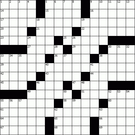 Across 1. Some may be cold 5. Landed 9. Fervidness 14. “Doctor Zhivago” character 15. Seat of Irish kings 16. Regional animals 17. Straightforward 20. Type of blanket 21. Appearance 22. Names in publishing 23. Not quick on the uptake 25. Civil rights worker Medgar 27. Rightmost column, typically 29. Samara source 30. Fissure 33. Young cod 36. Viscount’s superior 38. Vronsky’s love 39. Straightforward 42. Party servers 43. Like a Marine’s bed, usually 44. Genesis 45. Hold out one’s paw? 46. Parked oneself 47. Homestead’s county 49. Light sleeper 51. Peruse again 55. Part of F.D.R. 58. PC screen image 60. Born 61. Straightforward 64. Jerk one’s knee, perhaps 65. Picked-on instruments, for short 66. Basic bit 67. Princess of Colchis 68. Jane of literature 69. Invigorates (with “up”) Down 1. Shortcomings 2. Backing for an exhibit 3. Muse of poetry 4. Cap with a pompon 5. It suits you 6. Type of edition 7. Castle with many steps? 8. Feather bed? 9. Maintain to be true 10. Balsa vessels, e.g. 11. Type of citizenship 12. Story start 13. Opposite of “yippee!” 18. Makes improvements to 19. 1887 La Scala premiere 24. Low barks 26. Knowledgeable 28. Group with a lot of bills 30. Black wildebeests 31. Cost for a deal? 32. Bygone era 33. Give the brush-off 34. Place for seeds 35. Bilbo Baggins’ find 37. Explain further 38. Dogpatch denizen 40. Scythian warrior 41. Gnawing mammal 46. Musical composition 48. Wake from sleep 49. Terpsichore’s forte 50. Daring 52. Growing outward 53. Fabulous fabulist 54. Judges to be 55. Where students may go at night 56. Fencing tool 57. Take charge on the dance floor 59. A Witch of Eastwick 62. Expected 63. Insignia spot |