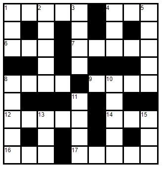 Across 1. Sweeper 4. Possesses 6. Homer Simpson’s expression 7. Bicker 8. Truth or ____ 9. Aid in wrongdoing 12. Arm joint 14. Writing fluid 16. Male offspring 17. After dark Down 1. Sleep on it 2. Not this; alternate 3. Breakfast or supper 4. Embrace 5. Not sour, salty, or bitter 8. Long female garment 10. Take along with you 11. Long-necked bird 13. Small round bread 15. Complete package |