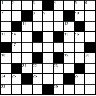 Across 1. Create unison 4. Eager 7. The (french) 8. Suitable 10. Mister 11. Interested; concerned 13. A cheer 15. Amount (abbr.) 17. Monkey or ape 18. Prefix meaning ‘3’ 19. Final; finish 21. Tear into strips 24. Identification (abbr.) 26. Sight organ 27. Prefix meaning ‘not’ 28. 12:00 29. Can’t be found Down 1. Run words together 2. You (old English) 3. Canadian Automobile Association 4. Had eaten 5. I am 6. Shucks; darn 9. Grades K-6 11. Short for Christopher 12. Had gone out together 14. April (abbr.) 16. Adult males 18. Slim 20. Make a depression 22. Female chicken 23. Snakelike fish 25. Perform a task 27. You and me |