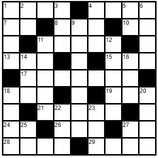 Across 1. Hair on the eyelid 4. Device for capturing 7. You and me 8. Female sheep 10. Mister 11. Sliced food staple 13. Buddy 15. Aries sign 17. Bird covering 18. Belonging to it 19. Had eaten 21. Pay money 24. Los Angeles 26. I am; he is; we ___ 27. __, myself and I 28. Simple 29. Magical stick Down 1. An abnormal swelling 2. Equally 3. Not him 4. Hot drink 5. Before noon 6. Graduation dance 9. Stormy; sunny; rainy; cold 11. Sanctify 12. Fear greatly 14. Toward the stern 16. Painting or sculpture 18. Not doing anything 20. Spotted 22. Give money for goods 23. Not used 25. Battery size 27. Two middle letters |
