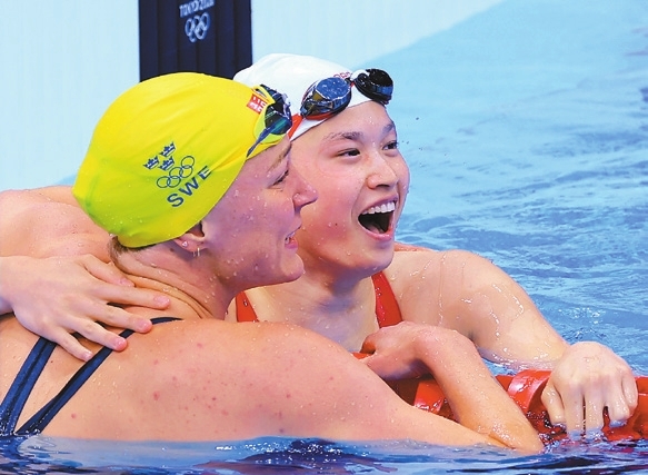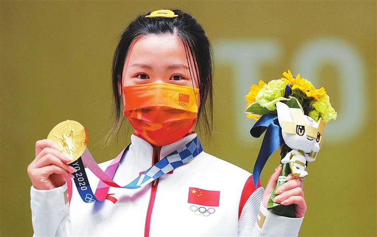 Chinese shooter Yang Qian celebrates after claiming the first gold of the Tokyo Olympics with a thrilling victory in the women’s 10m air rifle on Saturday. China got off to a flying start at the Tokyo Olympics on Saturday by winning three gold medals in shooting, fencing and weightlifting. China’s second gold came when Hou Zhihui won the women’s weightlifting 49kg event. Sun Yiwen edged Ana Maria Popescu of Romania to win China’s first women’s epee individual Olympic gold medal, also the country’s third gold of the day.Xinhua