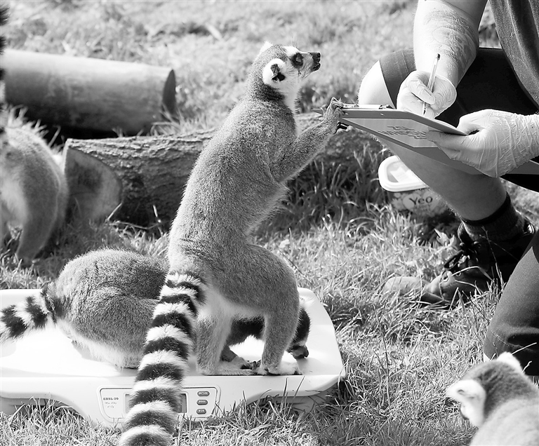 Zookeeper Jonathan Risbridgr encourages a ring-tailed lemur to stand on weighing scales at ZSL Whipsnade Zoo 2021 weigh-in and measurement, in Dunstable, Britain, on Tuesday. Reuters via Xinhua