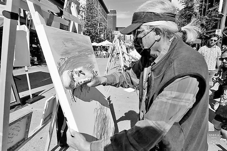 An artist works on his painting during the “Art Masters” painting competition in Vancouver, British Columbia, Canada, on Sunday. It is a painting competition with professional artists completing their works within one hour by using various supplies such as shoes other than brushes. SD-Agencies |