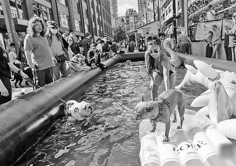 Dogs enjoy water at a pool during the “Pet-A-Palooza” event in Vancouver, Canada, on Sunday. The annual pet event returned this year after being canceled in 2020 due to the COVID-19 pandemic, which brought more than 1,000 dog owners to participate and share the joy with their pets through various activities. Xinhua |