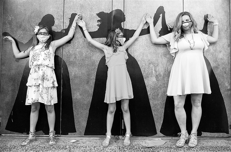 Audience pose for pictures as they exit the Richard Rogers theater at the end of the first return performance of Hamilton as Broadway shows begin to reopen to live audience after being closed for more than a year due to the outbreak of the coronavirus disease (COVID-19) in Manhattan in New York City, the U.S., on Tuesday. Reuters via Xinhua