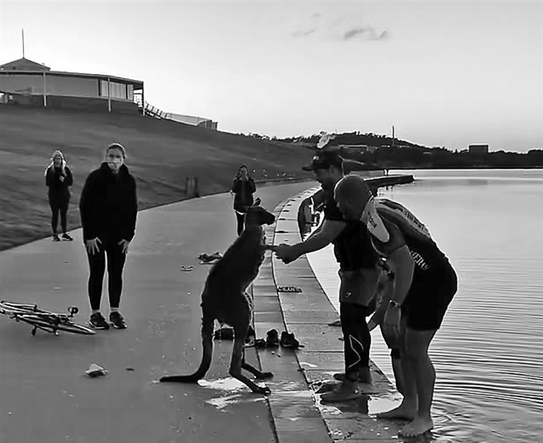 TWO men who rescued a kangaroo from a freezing river were offered a handshake by the Australian animal as it seemingly offered its thanks Tuesday. The rescuers were filmed lifting the kangaroo from the chilly waters of Lake Burley Griffin in Canberra, in a video that’s been widely circulated on social media. The kangaroo initially seemed nervous when the two men closed in, crouching low and then startling when the first man reached out to touch him. However, it eventually allows them to lift it up and is carried out of the water. Holding the animal between them, the two men walk to the edge of the lake, where they then pass the kangaroo up to a third man waiting on the pavement surrounding the water. Again, the kangaroo seems startled as it’s pulled up onto solid ground, turning around again to face the water before one of the men stands in front of it and holds its paws, seemingly to ensure it doesn’t jump straight back in. He briefly lets go of the creature’s paws, but the roo offers a paw back to him, in what appears to be a gesture of thanks. In the background of the clip he can be heard saying: “Aw, he’s thanking.” The video has been viewed over 400,000 times. Social media users appeared to have appreciated the locals’ rescue efforts. (SD-Agencies) |