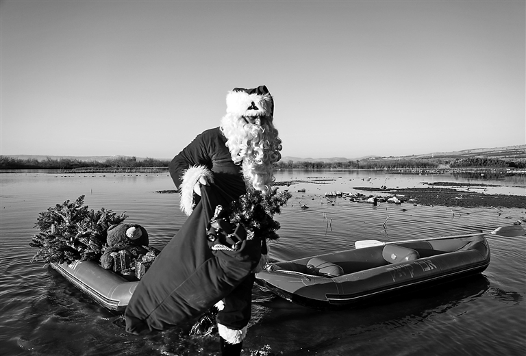 Issa Kassissieh, wearing a Santa Claus costume, holds a sack of Christmas gifts in an event organized by Israel’s tourism ministry, as the country gears up for the holiday season at the Sea of Galilee, northern Israel yesterday. Reuters via Xinhua