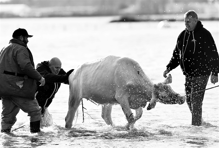 A cow that was stranded in a flooded barn is rescued after rainstorms lashed the western Canadian province of British Columbia, triggering landslides and floods, shutting highways, in Abbotsford, British Columbia, Canada on Tuesday. Reuters via Xinhua |