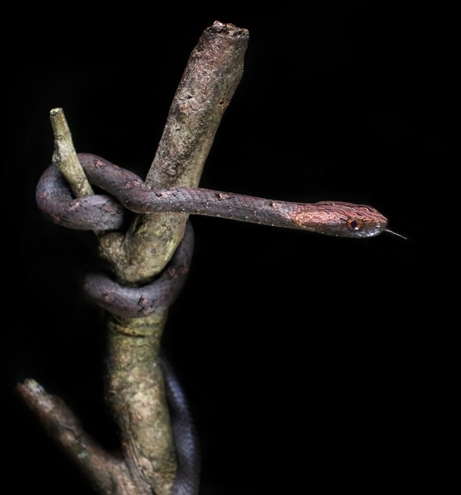 There is something fascinating about snakes, something that gives people reason to like them. Maybe it’s the mystery behind their eyes, their elongated limbless bodies covered by scales, their forked tongue, or probably the fact that all of them are carnivorous and some are extremely dangerous. However, the common mock viper (Psammodynastes pulverulentus) is not dangerous at all, at least not to humans. This fascinating reptile is one of the smallest snakes you can find in Shenzhen, measuring no longer than 50 or 60 centimeters. Thinner than a pinkie, it has a triangular-shaped head that is clearly differentiated from the neck. The striking patterns over the head manifest a wide range of colorations that go from red, orange to gray, and even black. The body also shows patterns of coloration where you can see white spots or yellow speckles along the side that goes from head to tail. Their colorful patterns and small size make them difficult to spot, as they easily blend with their surroundings. This species is active during both day and night, perhaps around pond areas looking for a small frog or a gecko. They hunt with their fangs, injecting a paralyzing venom into their prey. Fortunately, the venom is not harmful to humans and there are no known cases where their bite created a threat to a human life. Mock vipers are ovoviviparous, which means they are born from an egg, but instead of laying the eggs in a nest, the female keeps them inside of its body, giving the false impression that females give birth like mammals do. They reproduce sexually and can reproduce several times a year, giving birth to four to six baby snakes each time. Snakes are facing a difficult time due to the rapid development of urban areas. The last thing they want is having humans further threat their lives. The next time you take a walk in the park or hike the mountains, and happen to come across a snake, just admire it. Don’t get too close. Let it continue on its way back to safety! 2021.10.16 A common mock viper is seen on a branch in the Meilin Mountain in Futian District. |