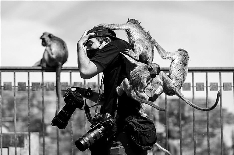 Monkeys climb on a news photographer at the Phra Prang Sam Yod temple during the annual Monkey Buffet Festival in Lopburi, north of Bangkok on Saturday. SD-Agencies