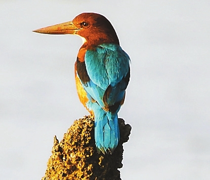 Everything about the white-throated kingfisher (Halcyon smyrnensis), also commonly known as the white-breasted kingfisher, is beautiful. Although light brown is the dominant color, their fantastic coloration pattern makes the species one of the most astonishing birds you can see in Shenzhen. The entire head and part of its body are covered by light brown feathers, except for the breast that is covered by beautiful white feathers, hence the name. Their large broad beak is reddish. Their wings are covered by a combination of brown, blue, white and black feathers, in a beautiful linear pattern; the dominant color is a light blue, with a distinctive white patch at the most distal part of the wings and also black tips. Their back and tail are also covered by strikingly bright blue feathers and their legs are short and red. White-throated kingfishers are relatively large animals, measuring up to 28 centimeters, with an approximately 44-cm wingspan. Like other kingfishers, their beak is big, heavy and broad, with a pointy end that allows them to get their prey by diving straight to them. Their diet includes crustaceans, fish, reptiles, amphibians and even insects. It is very common to see them in the Shenzhen Bay area feeding on crabs. Their nests are tunnels made in the ground where they lay up to six eggs. Little chicks will emerge from the eggs after about three weeks, ready for their first flight after another three weeks. Their population is stable, as they seldom have predators due to their rapid flight. However, protecting their habitats is a must, so we can keep enjoying their presence in our city for many years to come. 2021.01.03 A white-throated kingfisher is perched on a rock at the Shenzhen Bay in Nanshan District. |
