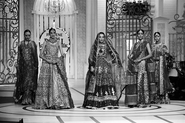 Models in wedding dresses walk on a catwalk during Pantene HUM Bridal Couture Week 2021, the most opulent and highest-profile bridal event in Pakistan on Sunday. The fashion week kicked off in the city of Gardens, Pakistan on Friday. SD-Agencies