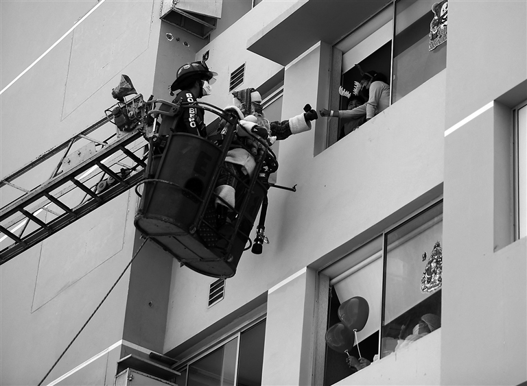 Paul Heinz Suarez Gamarra, locally known as the Peruvian Santa Claus, stands in a ladder basket of the local volunteer firefighter brigade, as he hands out presents to young COVID-19 patients at a hospital, in Lima, Peru on Tuesday. Reuters via Xinhua |