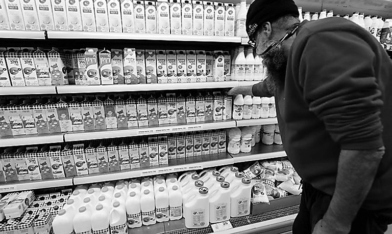 A staff arranges cartons of milk at a supermarket in central Israeli city of Modiin on Tuesday. Ahead of this year’s Hebrew Language Day which falls Saturday, milk cartons in Israel’s supermarkets have been printed with some new Hebrew words. Xinhua