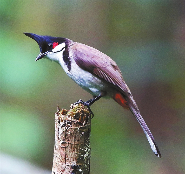 If you just arrived in Shenzhen for the first time, probably the first bird you’ll notice is the red-whiskered bulbul (Pycnonotus jocosus). This beautiful medium-sized bird has a prominent black crest and a striking red patch on the ear. Its body is covered by white feathers; the wings are brown with white tips; the lower part of the body where the tail begins is also red. Not just are the bird’s patterns a total delight to observe, but its singing is beautiful to hear as well. The bird can grow up to 28 centimeters long, with a wingspan about the same length. It can be seen feeding on fruits, flower buds or small insects, moving most of the time in pairs or in small groups. They are often seen in the company of Chinese bulbuls, basically in every corner of our city. The red-whiskered bulbuls’ breeding season goes from February to August, when the birds will build their nests and lay up to three eggs per clutch. It takes around two weeks for the eggs to hatch. With a fairly big population, they are not considered an endangered species. Their predators include cats, bloodsucker lizards and snakes. 2021.06.05 A red-whiskered bulbul is seen perched on a broken branch in Bijia Mountain, Futian District. |