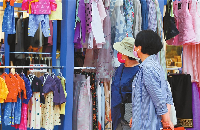 Women wearing face masks shop for clothes at a market in Hanam, Gyeonggi-do, South Korea, in this file photo. South Korea’s online shopping came to 17.5 trillion won (US$14.7 billion) in November, a record high since the data began to be compiled in 2001, official figures showed yesterday. It has been the third straight month that the country’s online sales broke the record.Xinhua |