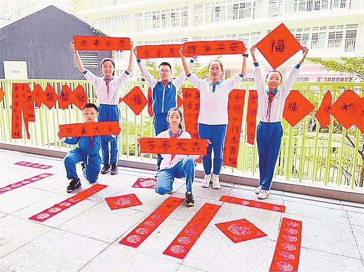 Students of Xinsha Primary School, Futian District write the Spring Festival wishes on couplets to celebrate the Spring Festival.