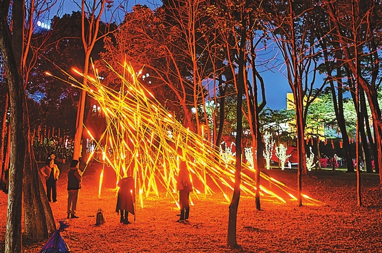 VARIOUS shapes of festival lights ranging from astronauts, tigers, fish, butterflies, swans and crabs adorn Futian District’s Civic Park, Xiangmi Park and Huaqianbei Pedestrian Street until Feb. 20. Civic Park, located in the south square of Civic Center, is the main light show venue that features more diverse designs than the other two venues. An array of astronaut-shaped lights, an expression of Chinese national pride, is one of the most popular installations that passers-by take photos with. Lights showing an adorable kid holding lotus flowers and a big fish symbolize that the fortune and abundance of food we had will continue in the coming year. A fascinating and playful distortion mirror and a clown-shaped light provide children lots of fun. Despite using a lot of cutting-edge technologies, many lights are largely inspired by the natural world, featuring recreations of a bonfire and butterflies at Civic Park, mantises, dragonflies and crickets at Xiangmi Park, and crabs, shrimps and fish at Huaqiangbei Pedestrian Street. Likewise, don’t miss checking out a pair of elegant swan-shaped lights on a lake in Xiangmi Park, a romantic place for couples to pledge their love as Futian’s marriage registration office is located inside the park. At Huaqiangbei Pedestrian Street, try to interact with some cute little “tigers.” The tigers run upon inserting a token, wishing people blessings, and all proceeds will be donated to Shenzhen Red Cross Society. (Cao Zhen) |