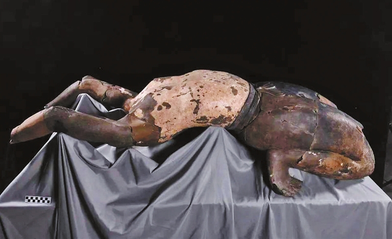IN contrast to the previously unearthed terracotta warriors that are either sitting or standing, a figure in a rarely seen position made its public debut last weekend after being restored in Xi’an, Northwest China’s Shaanxi Province. The No. 28 figure was given the temporary name “supine figure” and was unveiled at a ceremony coinciding with China’s Cultural and Natural Heritage Day on June 11 at Emperor Qinshihuang’s Mausoleum Site Museum. The figure is kneeling on the ground and leaning backwards to its back that touches the ground. It was discovered in a severely damaged state. It took nine months to restore the figure which measures 1.54 meters in length and weighs 101 kilograms although the statue is still missing parts of its hands and head. There are fingerprints on the belly and lacquer stains on the arms that can be studied further, providing clues into the handicrafts used to create the figure, according to the restoration team. Archaeologists discovered the figure at the Acrobats Pit, or Pit 9901, which was first exavated in 1999. Nearly 30 colored figures had been found in the pit from 2011 to 2013. To date, 25 of them have also been restored. Different from terracotta soldiers and civil officials in other burial pits, figures in Pit 9901 might portray the acrobats who performed in the imperial palace in the Qin Dynasty (221-207 B.C.), according to the museum. Since more than 7,000 life-sized terracotta warriors and horses were discovered at Emperor Qinshihuang’s Mausoleum in 1974, more and more satellite pits began to be known and unearthed. (Xinhua, Global Times) |