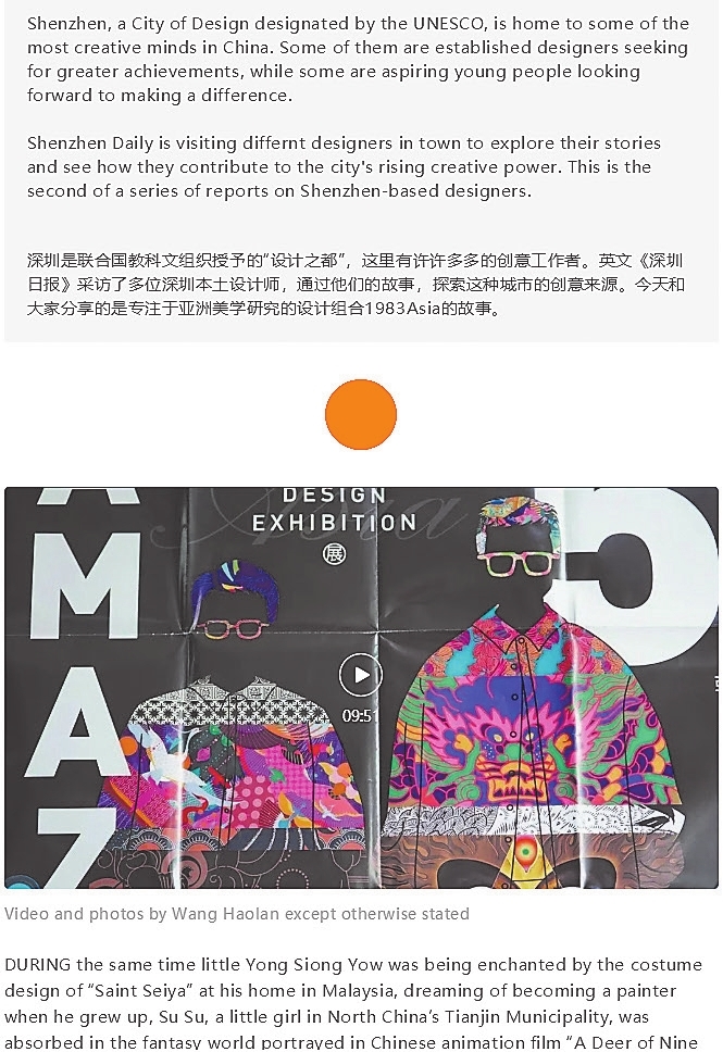 2022-05-15 Shenzhen, a City of Design designated by the UNESCO, is home to some of the most creative minds in China. Yong Siong Yow from Malaysia and Su Su from Tianjin, northern China, both born in 1983, are two aspiring young designers behind the studio 1983Asia, which specializes in brand, packaging and mascot design as well as art crossovers that render traditional Asian culture and aesthetics into modern visual expressions. Asian comics and animations led the duo to a life path in design, while the desire to explore the possibility of design from the perspective of Asian culture brought them together as a team. |