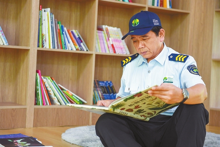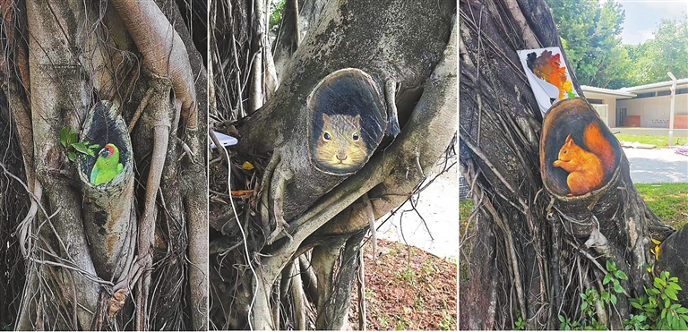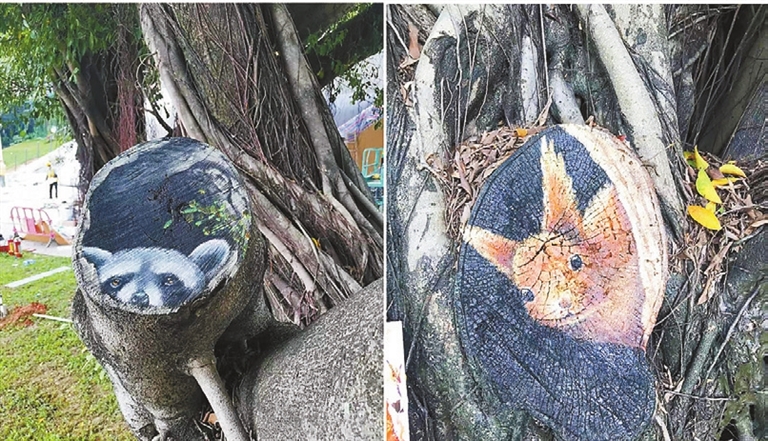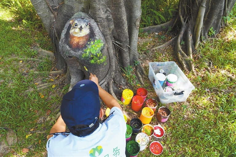 A “DEER” is wandering in the green bush, a “squirrel” is chewing nuts on a tree stump, two “white rabbits” are frolicking in the meadow, and a “marmot” is protruding its head from a ground hole. You are seeing these scenes not in a zoo but in some parks in Shenzhen. Li Ping, a Shenzhen Central Park security guard in his 50s, has amazed residents with his paintings of animals and plants in local parks. Over the past two years, he has drawn more than 300 paintings on tree stumps, manhole covers, electric boxes and walls, adding vitality and beauty to Shenzhen Central Park, Cuizhu Park, Lianhua Hill Park, Renmin Park and Shenzhen International Garden and Flower Expo Park. A native of Hubei Province in Central China, Li came to Shenzhen in 2019. With painting skills, Li had applied for jobs in Dafen Oil Painting Village but later worked as a security guard at Cuizhu Park in Luohu District. To make mundane manhole covers, electric boxes and tree stumps more infused into the beautiful environment of the park, Li began to paint on them and later was invited by more local parks to create paintings. (Cao Zhen) |