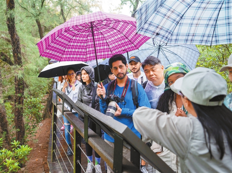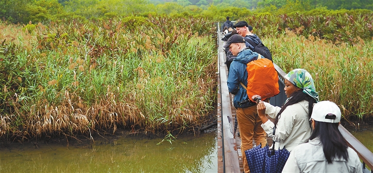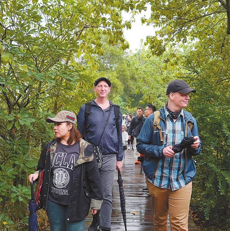 Guided by Dr. Yang Qiong, professor of engineering at the Guangdong Neilingding Futian National Nature Reserve Administration, the group, consisting of expats from the U.S., the U.K., Russia, Australia, Singapore, Malaysia, Japan, the Czech Republic, Italy, the Philippines, Bolivia, and Pakistan, walked through the dense mangrove forests. They stopped at several points to learn about mangroves, and admire and capture the beauty of the unique ecosystem with their cameras.