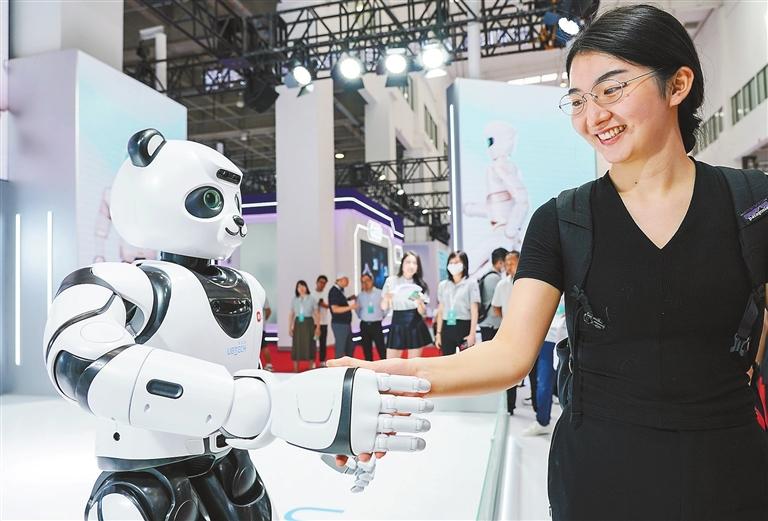 A robot shakes hands with a visitor at the 2023 World Robot Conference in Beijing yesterday. The event, which will last until Aug. 22, has attracted more than 140 domestic and foreign robot companies. Xinhua