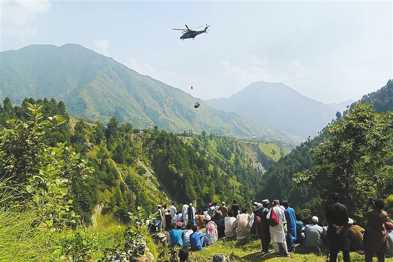 People watch as a military helicopter is in the midst of a rescue operation that lifted eight people from a stranded cable car in northwest Pakistan on Tuesday.