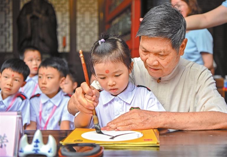 A teacher teaches a first-grader traditional Chinese calligraphy during a ceremony to mark the opening of a new semester at a school in Guangzhou, Guangdong Province, yesterday.China News Service