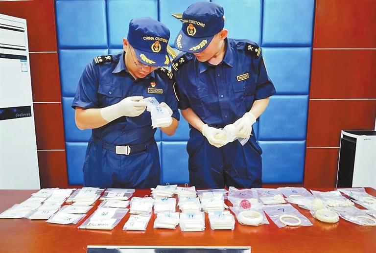 Staff members of customs check ivory products and red coral products in Taiyuan, North China’s Shanxi Province, on Monday. The ivory items, weighing nearly 2.1 kg, and four red coral products, weighing 70 grams, were seized in inbound parcels, according to the local airport customs. China suspended imports of ivory and ivory products in 2015 and ended related commercial processing and sales at the end of 2017 as part of its commitment to protecting wild animals.Xinhua |