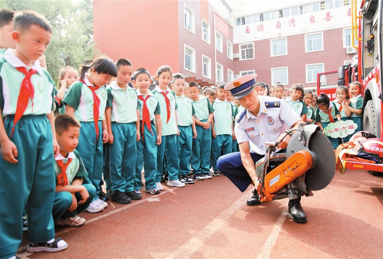 A firefighter shows students how to use firefighting equipment during an event to mark the first lesson in the new semester at a school in Chengde, Hebei Province, yesterday. Xinhua
