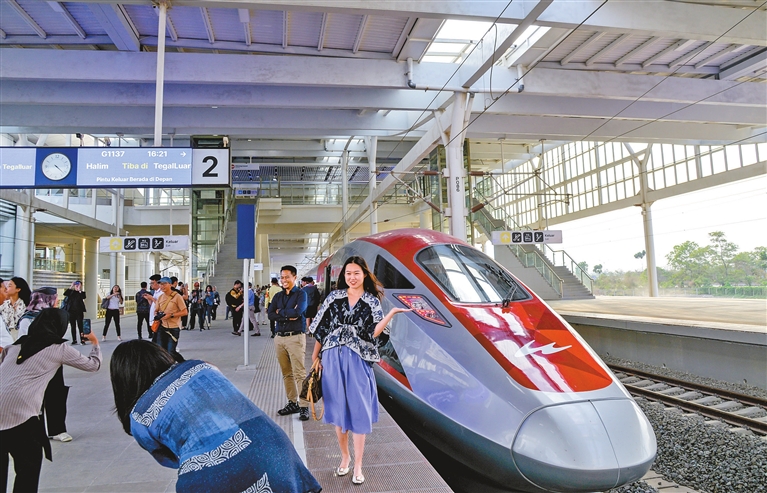 Passengers pose for a picture at the high-speed railway station in Bandung, Indonesia, on Tuesday. The Jakarta-Bandung High-Speed Railway, a landmark project of the Belt and Road Initiative (BRI), started official operation Tuesday. The 142-kilometer line has cut the travel time between the two destinations from 3 1/2 hours to 46 minutes. China News Service |