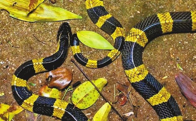 THE banded krait (Bungarus fasciatus) is a remarkable snake measuring up to 2 meters in length. It appears visually striking, with alternating black and yellow or white bands encircling its body. These bands provide excellent camouflage in its natural habitat, blending seamlessly with its surroundings. Its head is small and slightly flattened, and it possesses a distinctive black band across its eyes. Its rounded and broad tail is often used to distract predators, which may mistake it for a head while its real head remains hidden under its body. The banded krait can be found in various habitats, including forests, grasslands and agricultural areas. It is primarily found in Thailand, Malaysia, Indonesia and China. This adaptable snake can thrive in terrestrial and aquatic environments, seeking refuge in burrows, rock crevices or under logs during the day. Predominantly nocturnal, it prefers to hunt and explore under cover of darkness. It is also known for its secretive nature, often avoiding human encounters. When threatened, the banded krait may adopt a defensive posture, coiling its body and hiding its head or performing aggressive body movements to escape. This venomous snake relies on its neurotoxic venom — the result of natural selection and adaptation — to subdue its prey. Its diet primarily consists of other snakes, including small cobras and kraits. It also feeds on lizards, frogs and occasionally small mammals. The banded krait immobilizes its prey with potent venom, and then swallows its meal whole. The banded krait plays a vital role in maintaining the ecosystem’s balance. As an apex predator, it helps control populations of smaller reptiles and mammals, contributing to the stability of the food chain. |