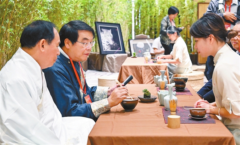 Visitors try dian cha, or powdered tea, during the Chinese Culture and Art Festival in Guangzhou, Guangdong Province, on Monday. The event attracted nearly 1,000 overseas Chinese, including 200 leaders of overseas Chinese associations from more than 50 countries and regions.China News Service |