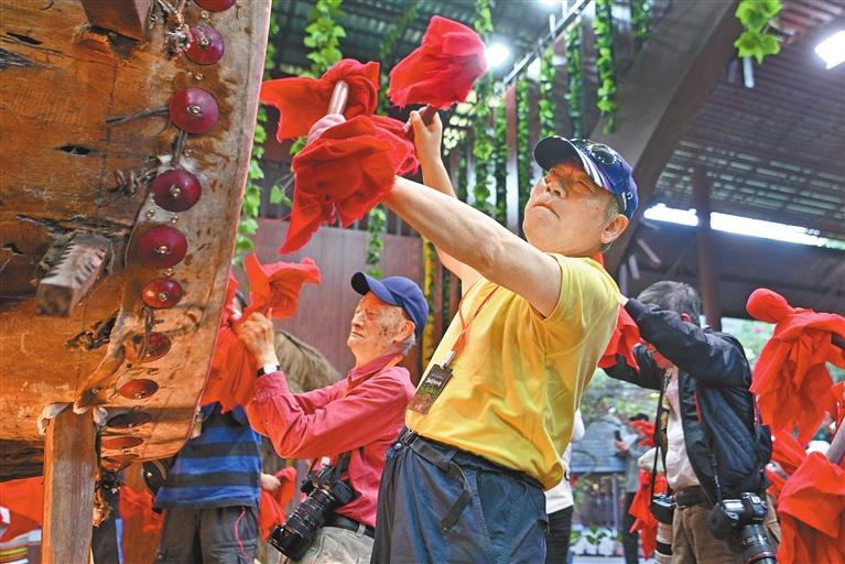Photographers from Chinese mainland and Taiwan experience the Jinuo drum dance in Jinghong, Yunnan Province, on Sunday. The drum dance was included in the first batch of national intangible cultural heritage list in 2006. The event was part of a cross-Strait cultural exchange tour for photographers.  China News Service