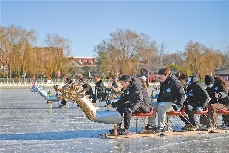 Players compete during an ice dragon boat race in Beijing yesterday. The Ice and Snow Sports Cultural Festival opened in Beijing’s Shichahai Lake area yesterday, attracting 400 players to compete in eight winter sports. China News Service