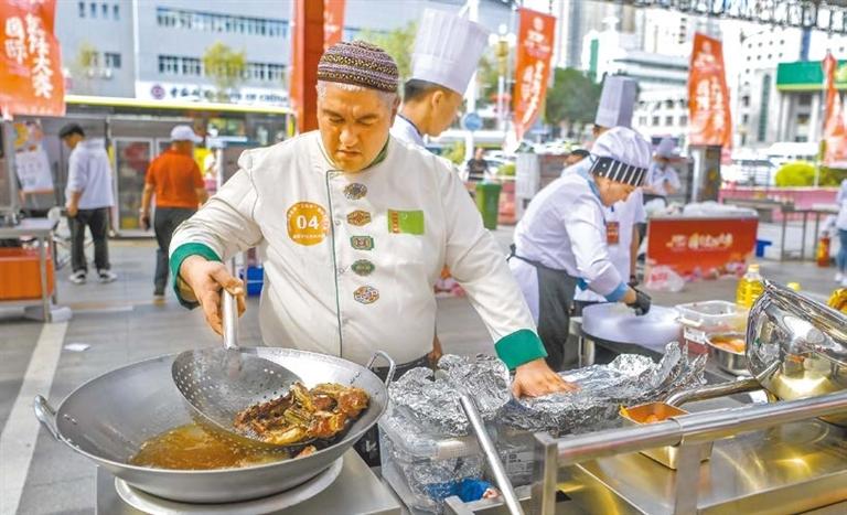 A master chef from Turkmenistan cooks at the first “Workers’ Cup” International Culinary Competition in Urumqi, Xinjiang Uygur Autonomous Region, on Monday. The three-day event features the international culinary arts contest and the international culinary skills contest, attracting over 100 culinary experts from around the world. China News Service