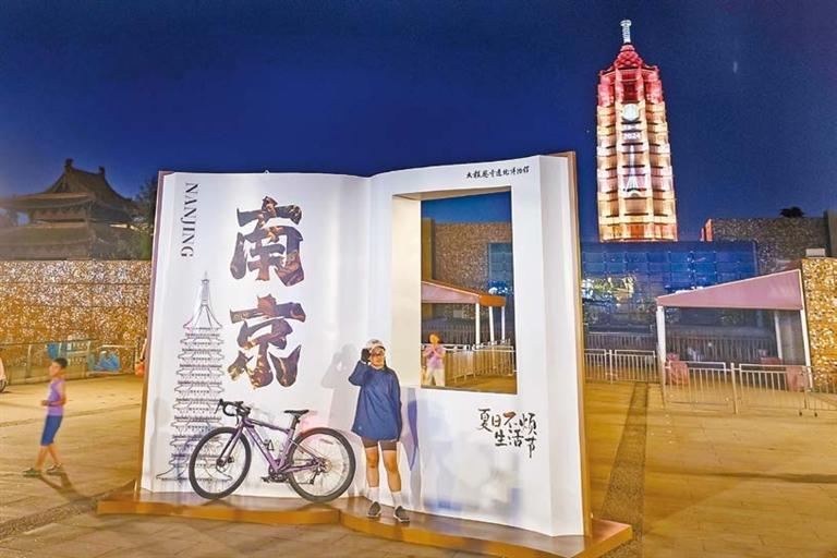 Nanjing’s Da Bao’en Pagoda lights up with 2024 Paris Olympics theme elements on the evening of Sunday, showing support for the Olympic Games.China News Service