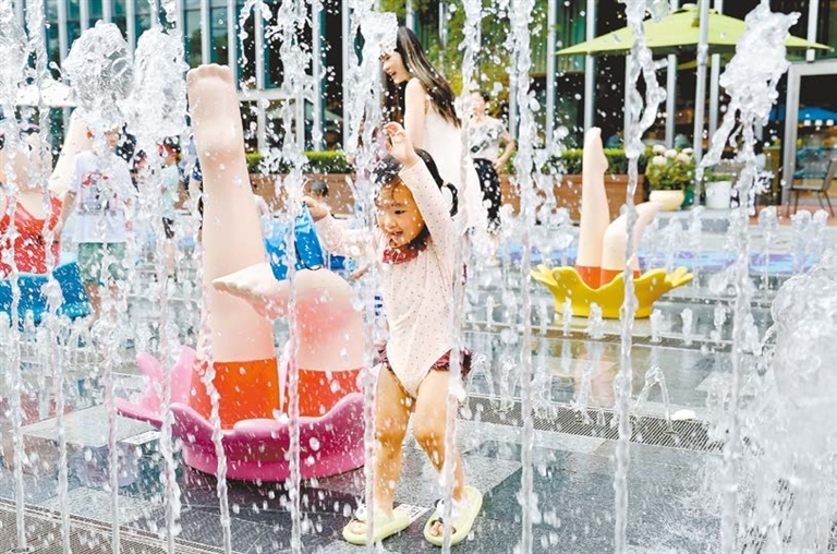People play in the fountain square at Jing’an Kerry Center in Shanghai on Saturday. High temperatures have gripped most parts of China over the past week. The Shanghai Meteorological Center issued an orange high-temperature warning signal on Saturday and Sunday, with temperatures expected to exceed 37 degrees Celsius due to the influence of subtropical high pressure. China News Service |