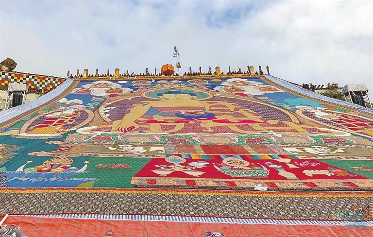 An enormous thangka painting of Buddha is unrolled on a platform on the hillside for sunning in Lhasa, Xizang, on Sunday. Celebrations marking the traditional Shoton Festival, or Yogurt Festival, began in Lhasa on Sunday. ?Xinhua