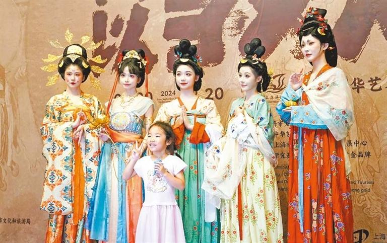 A girl poses for a photo with models dressed in Dunhuang-style clothing at a ceremony announcing the upcoming “The Great Art of Dunhuang” exhibition at the China Art Museum in Shanghai on Tuesday. The exhibition, which is set to open at the China Art Museum on Sept. 20, features a wide array of rare artifacts from the collection of the Dunhuang Academy in Northwest China’s Gansu Province. Xinhua |
