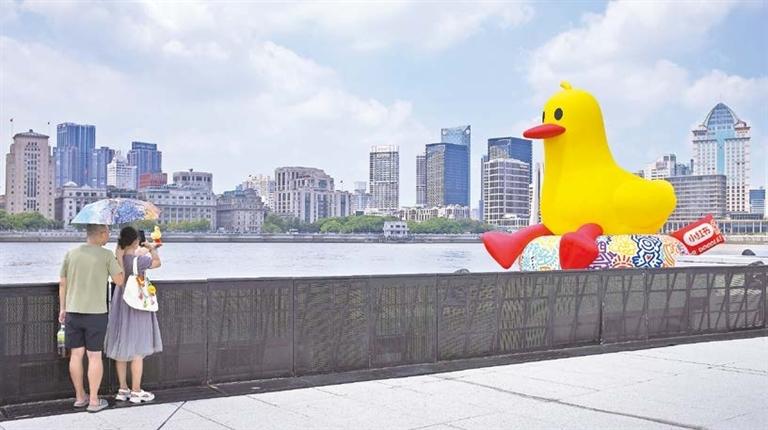 Visitors take photos of an inflatable rubber duck on the Huangpu River in Shanghai on Sunday. This 20-meter-high installation is the centerpiece of the second Xiaohongshu Road Life Festival, an ongoing cultural event in Shanghai featuring various activities related to music, art, photography, sports and life.China News Service |