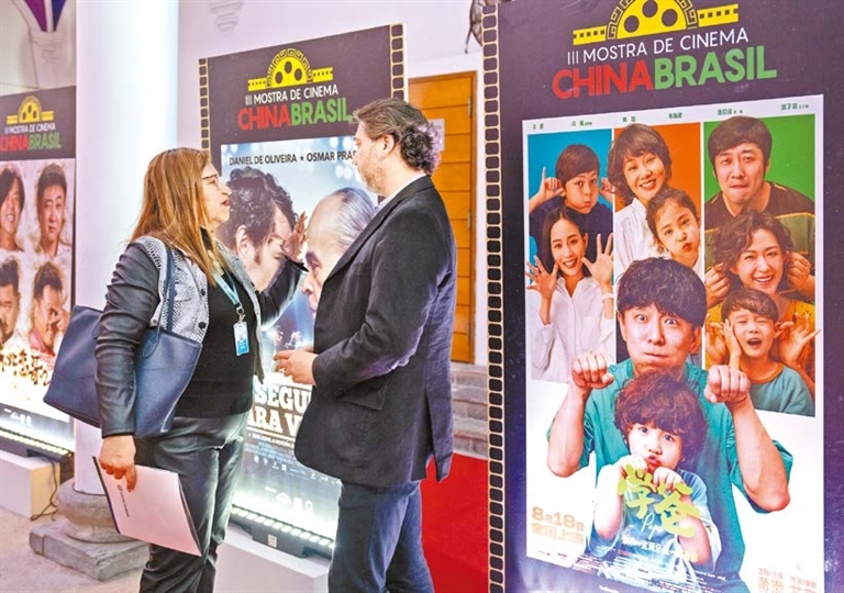 Visitors engage in a discussion next to Chinese and Brazilian movie posters at the China-Brazil Film Exhibition in Rio de Janeiro, Brazil, on Monday. The third China-Brazil Film Exhibition kicked off here on Monday, with 14 films from both China and Brazil to be screened from Tuesday to Friday. Xinhua |