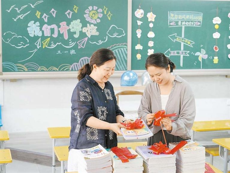 Two teachers at Mingzhu Huayuan Primary School in Shijiazhuang, Hebei Province, are making preparations for the upcoming school term yesterday. The fall semester of most kindergartens, primary and secondary schools across China will start Sept. 1. Xinhua |