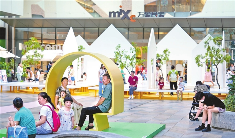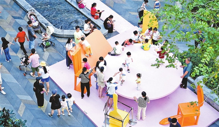 IN celebration of its second anniversary, the MixC Sungang in Luohu District has introduced a unique addition to its landscape by placing eight types of creatively designed chairs throughout the property, turning the mall into a playground for shoppers. Designed by Gu Tian, these chairs serve a dual purpose, transcending their conventional function as furniture to embody metaphors of relationships and a carefree outlook on life. Visitors will encounter innovative designs such as elongated chairs resembling origami structures, a round table surrounded by chairs featuring elements of kitchen utensils, and a playful assembly of horse-shaped seats in a circle, appearing as a whimsical merry-go-round. As night falls, the mall, known for its pet-friendly environment, transforms into a joyful sanctuary for both children and families with pets. Discover this charming venue through the lens of Shenzhen Daily photographer Lin Jianping.(SD News) |