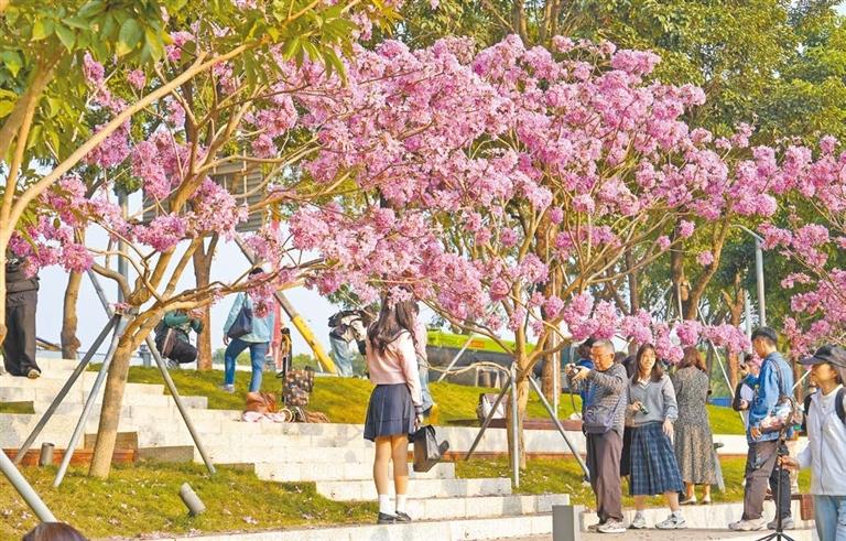 THE pink trumpet trees (Tabebuia rosea) are in full bloom at the Houhai Zhongxin River Park in Nanshan District, transforming the park into a vibrant sea of soft pink flowers. The picturesque sight, reminiscent of a dreamy anime scene, has become a must-visit spot for locals and tourists alike. The flower season for these trees runs from mid-December through March. During this time, the trees are covered with clusters of delicate pink flowers before their leaves begin to sprout. From a distance, the trees appear as puffy pink clouds, while up close, the flowers resemble small, hanging wind chimes, creating a serene and enchanting atmosphere. Located along both banks of the Zhongxin River in the park, approximately 100 pink trumpet trees are currently in full bloom. On sunny days, visitors flock to the park to capture the beauty of the trees with the perfect backdrop of blue skies, white clouds, and lush green grass. Whether you’re a photography enthusiast or simply looking to enjoy the tranquil surroundings, the park offers an idyllic setting for a day out. Photography tips: ● For the best lighting, it’s recommended to visit before 10 a.m. or after 3 p.m., when the sunlight is softer and more flattering. ● The park is primarily home to purple and pink trumpet trees. Wearing white or light-colored clothing will make your photos stand out and complement the soft tones of the flowers. ● For a creative touch, consider bringing props like books, magazines, picnic blankets, or newspapers to add a cozy, atmospheric feel to your photos. Venue: Houhai Zhongxin River Park, Nanshan District Metro: Line 2 to Wanxia Station, Exit A; then walk for about 16 minutes (Tang Li) |