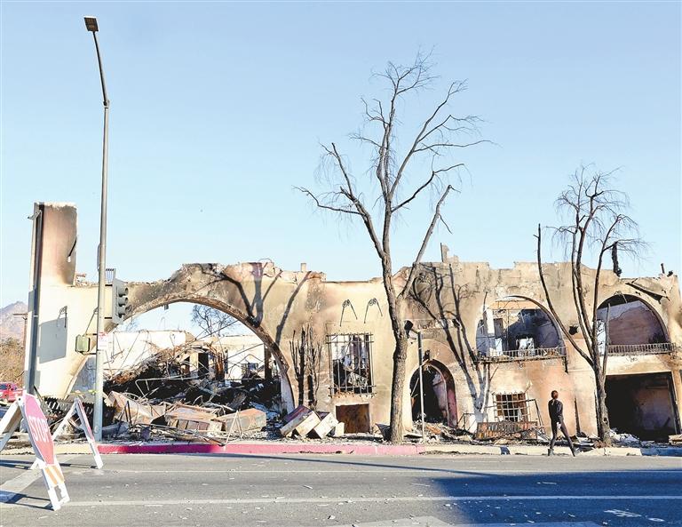A building destroyed by the wildfire is seen in Altadena, Los Angeles, the United States on Monday. Crews made progress battling Los Angeles County's second-largest wildfire over the weekend, though a red flag warning remains in effect this week with more fierce winds forecast. The death toll has risen to 16 in connection with the Eaton Fire, which began before 6:30 p.m. last Tuesday in Eaton Canyon near Altadena and Pasadena and has devastated the Altadena area. Xinhua |