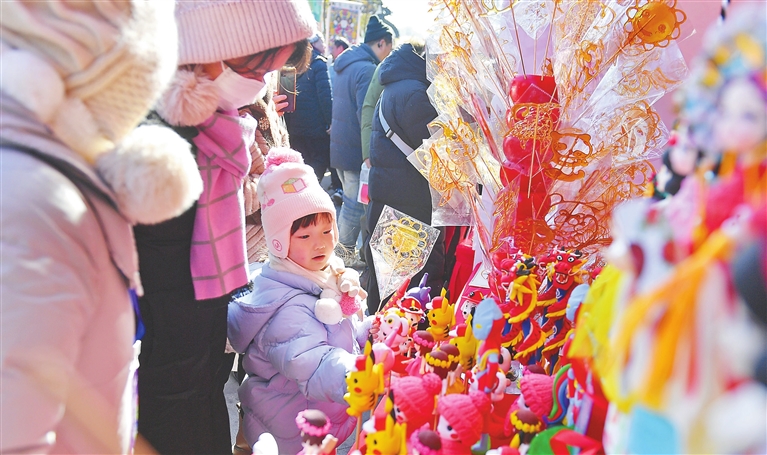 A child carefully chooses her purchase from a booth offering dough sculptures and syrup paintings at a bustling pedestrian street in Qingdao, Shandong Province. The street is adorned with numerous booths exhibiting intangible cultural heritage items to mark the Lantern Festival, which falls on this day this year. Xinhua |